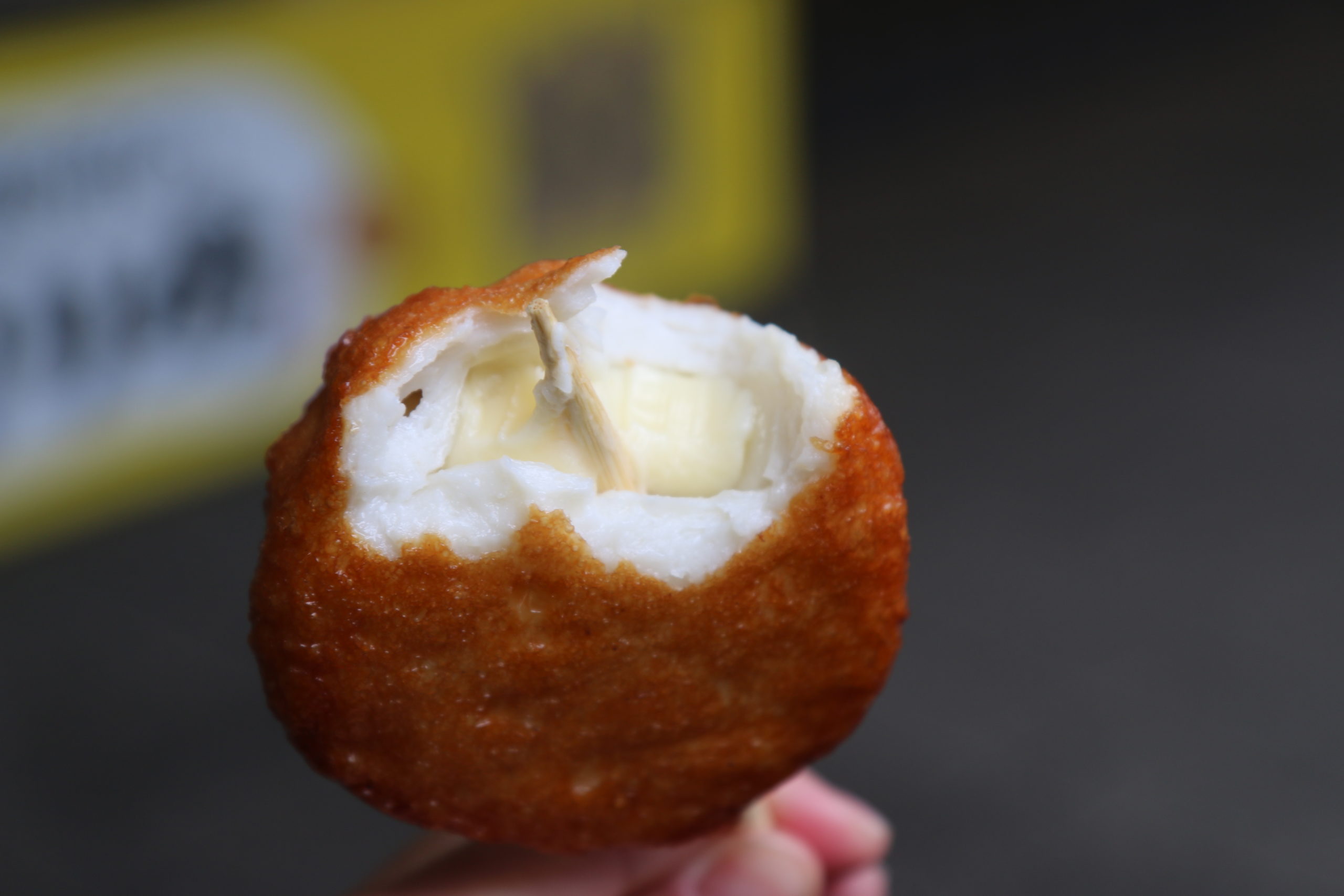 中には濃厚で柔らかいチーズがたっぷり。大人はビールがほしい味です(売ってます)。