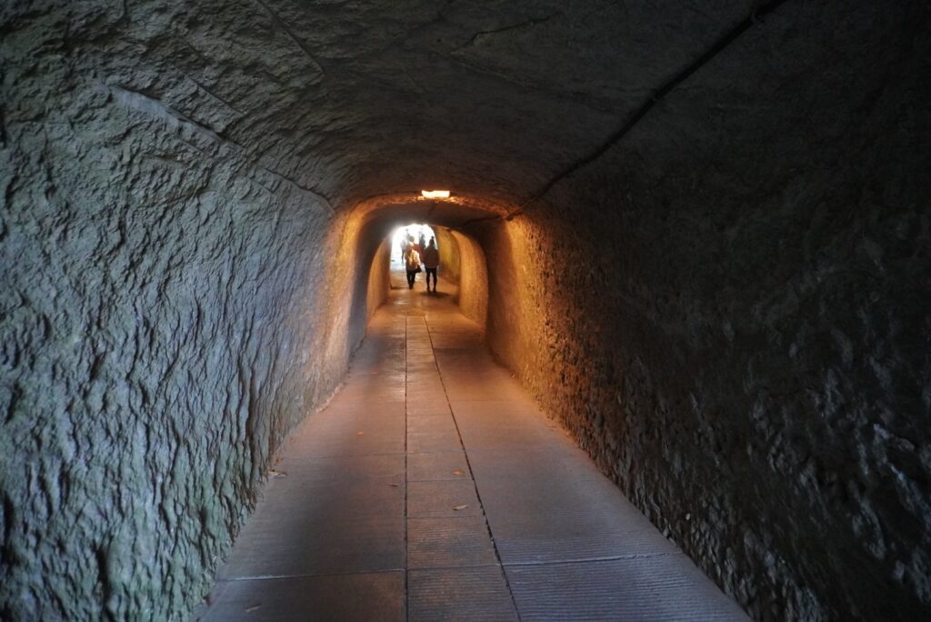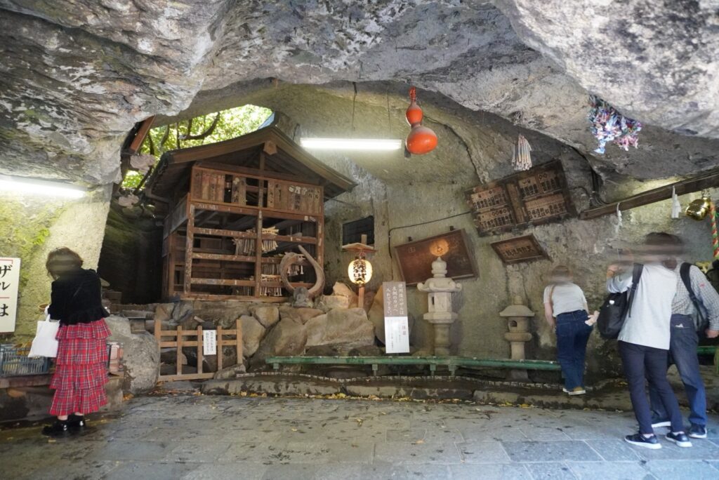 岩山をくり抜いたトンネルをくぐり抜けると、ひんやりとした空気に一変。奥宮へと続く神秘的な道でした。