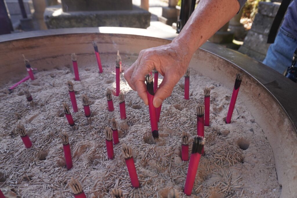 入口でお線香とローソクを購入(200円)して献じたあと、お金を清めるための「ザル」を手に洞窟の中へ。