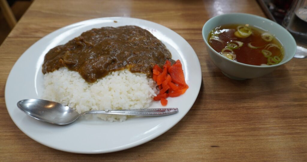 いただいたサンマーメンは横浜中華街発祥で、横浜、鎌倉などの湘南地方に広く伝わっています。とろみのある野菜たっぷりの熱々スープで、ハイキング後の身体に染み渡りました。カレーライスも店員さんおすすめの一品。手作り感のある家庭的なホッとする味でした。