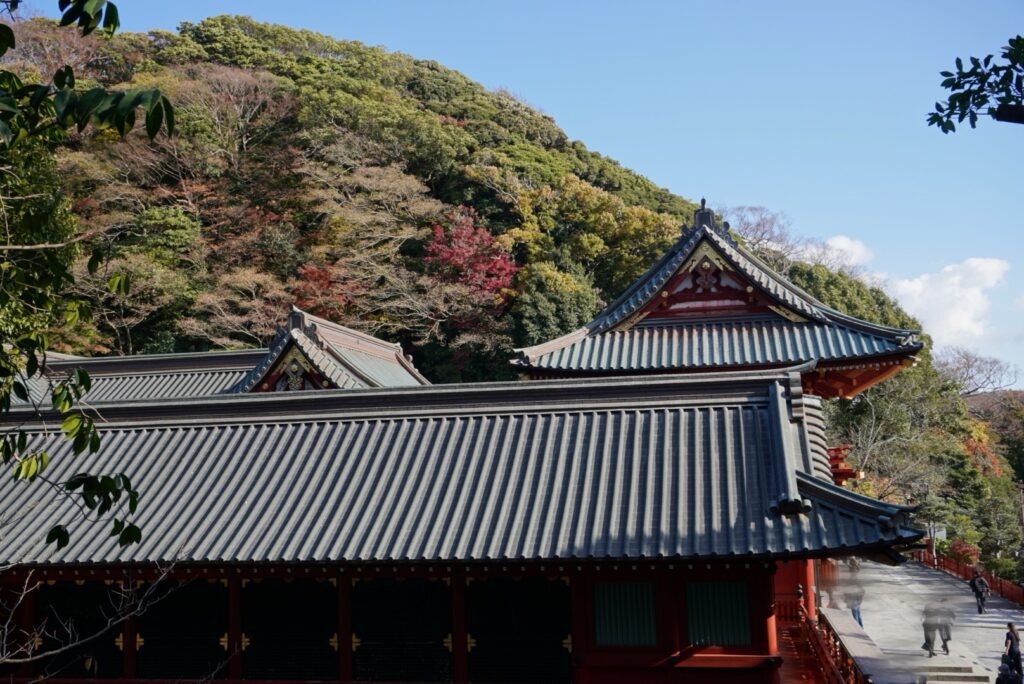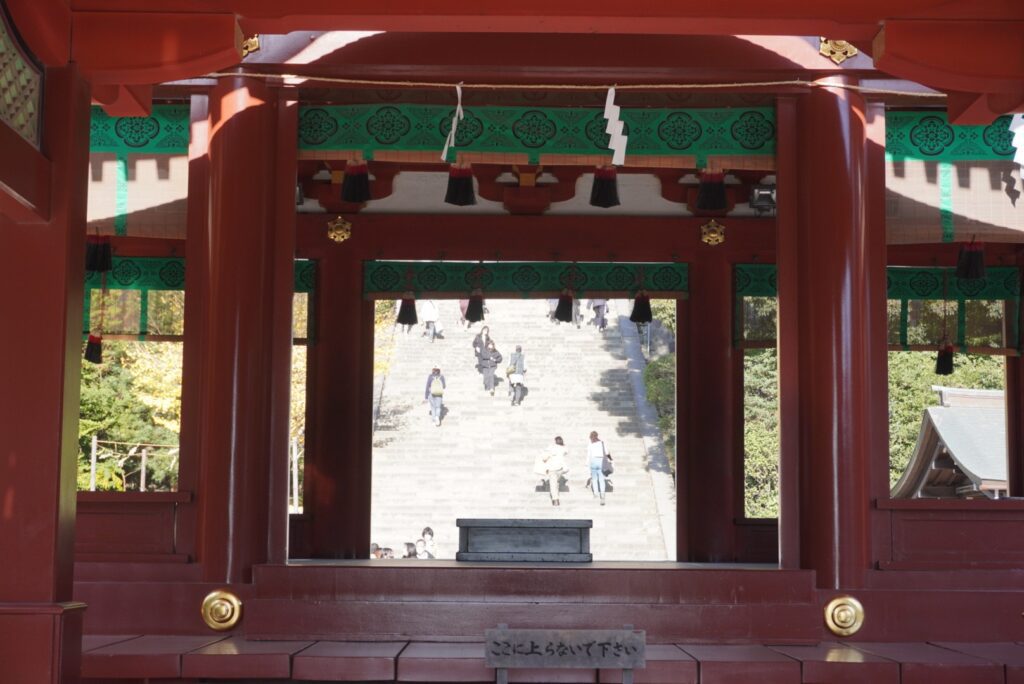 右の写真は鎌倉の中心にある「御谷の森(おやつのもり)」です。その深い緑を背に立つ社殿はまさに見どころ。無意識に足を止めて見入ってしまいました。