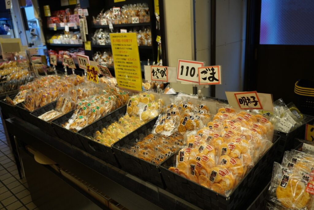店内には約100種類ものせんべいがずらりと並んでいます。その中から5品をお土産に購入しました。5袋で1,880円。手頃な値段なのに満足度が高く、ちょっとした手土産にもぴったりでした。