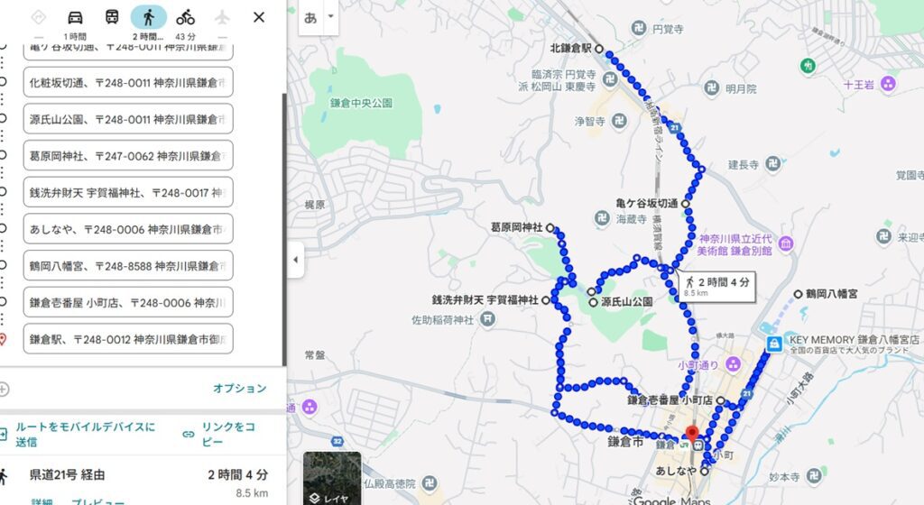 JR横須賀線「北鎌倉駅」→【切通し】【亀ヶ谷坂切通し】→【化粧坂切通し】→①【源氏山公園】→②【葛原ヶ岡神社】→③【銭洗弁財天宇賀福神社】→④【中華あしなや】→⑤【鶴岡八幡宮】→⑥【壱番屋】→江ノ島電鉄線「鎌倉駅」