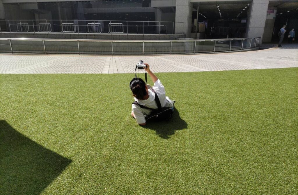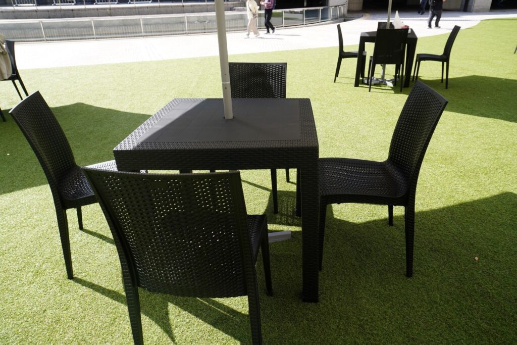 人工芝が敷かれ、とてもきれいな空間で、休憩している観光客やビジネスパーソンの姿もちらほらとありました。