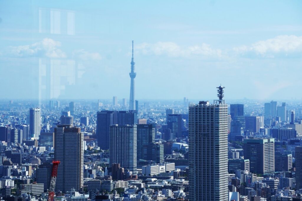 ビルの谷間に広がる東京の街並みと中央にそびえる東京スカイツリーが見えました。