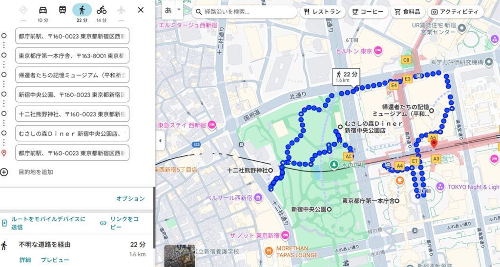 都営大江戸線「都庁前駅」→①【東京都庁舎】→②【東京都庁舎展望室】→③【東京都庁職員食堂 第一本庁舎】→④【平和祈念展示資料館】→⑤【新宿中央公園】→⑥【熊野神社】→⑦【むさしの森Diner新宿公園店】→「都庁前駅」